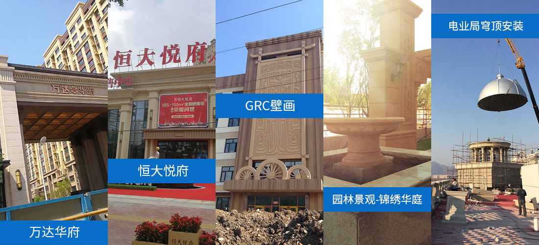 本企業(yè)的產(chǎn)品被廣泛應(yīng)用于建筑室內(nèi)及外墻的裝飾、裝修工程和市政、園林景觀的造景等。主要產(chǎn)品有檐線、門(mén)窗裝飾線、穹頂、扶手墩、山花、浮雕裝飾板、中式西式的傳統(tǒng)裝飾、歐式羅馬裝飾柱、仿蘑菇石、仿剁斧石、仿干粘石、假山、噴泉、圓雕、藝術(shù)壁畫(huà)、外墻掛板、室內(nèi)石膏線、燈盤(pán)、浮雕、羅馬柱等。均可根據(jù)客